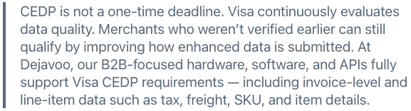 CEDP becomes the only framework Visa uses for qualifying B2B commercial transactions for lower interchange.